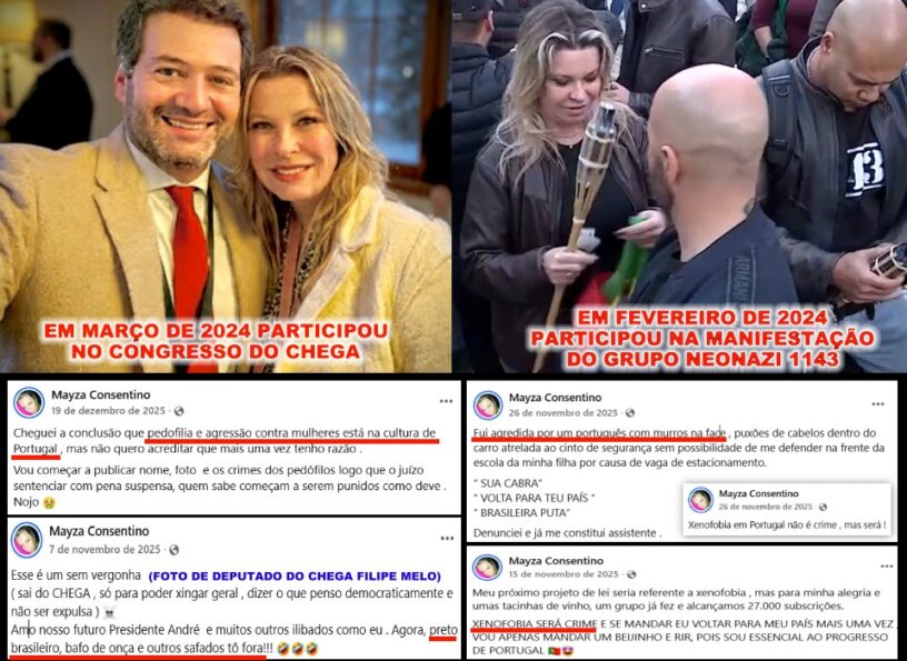 Mayza Consentino, a advogada brasileira de cinco arguidos dos 37 elementos do grupo 1143 detidos no processo onde estão indiciados de crimes como o incitamento ao ódio e à violência, que surge em imagens (em vídeo – SIC Notícias) ao lado de Mário Machado numa manifestação do grupo neonazi em fevereiro de 2024 e um mês antes aparecia na Convenção do Chega, disse aos jornalistas que o 1143 “É um grupo de convívio, não tem ali nada de violência”.