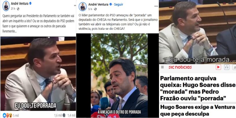 Ontem, André Ventura partilhou um vídeo editado onde colocaram uma legenda manipulada a Hugo Soares: “Eu dou-te porrada”, e escreveu: