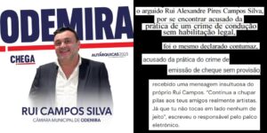 Rui Alexandre Pires Campos Silva, candidato do Chega a Presidente da Câmara Municipal de Odemira, tem várias notificações de contumácia e um histórico de crimes como emissão de cheques sem provisão e condução sem carta. Numa investigação divulgada pela página do Jovem Conservador de Extrema-Direita, o Conselheiro Nacional do partido de André Ventura, militante 9928, … Continue a ler Candidato do Chega a Presidente da Câmara de Odemira tem histórico de crimes como emissão de cheques sem provisão e condução sem carta