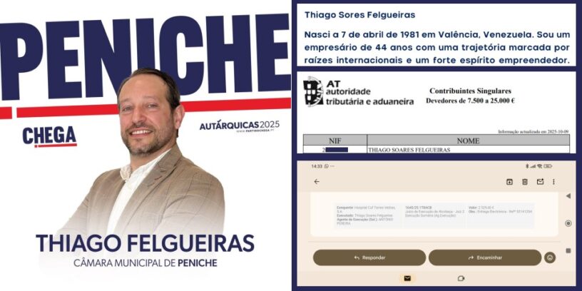 Thiago Soares Felgueiras, nascido em Valência, Venezuela, candidato do Chega a Presidente da Câmara Municipal de Peniche tem o nome na lista dos devedores do Fisco referente a Contribuintes Singulares – Devedores de 7.500 a 25.000 euros.