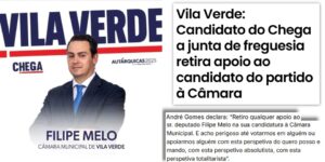 António Filipe Dias Melo Peixoto, candidato do Partido de André Ventura a Presidente da Câmara Municipal de Vila Verde nas Eleições Autárquicas de 12 de outubro de 2025, foi eleito autarca pelo partido da extrema direita em Braga para o Mandato 2021-2025 mas não esteve presente em 19 Sessões (em 45 possíveis) na Assembleia Municipal … Continue a ler Candidato do Chega a Presidente da Câmara de Vila Verde não esteve presente em 19 sessões da Assembleia Municipal de Braga