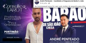 André Penteado, candidato do Chega nas próximas eleições autárquicas a Presidente da Junta de Freguesia de Barão de São João, Lagos, é Tarólogo Vidente especialista em Casos Amorosos e Financeiros. O “Tarólogo André”, que assumiu ser homossexual “sem vergonha” na sua página de candidato do Chega (se calhar devia era ter vergonha por ser do … Continue a ler Candidato do Chega a Presidente da Junta de Freguesia em Lagos é Tarólogo Vidente e homossexual “sem vergonha”