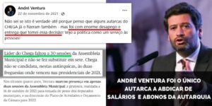 André Ventura foi candidato a Presidente da Assembleia Municipal de Moura nas Eleições Autárquicas de 2021, mas apesar de derrotado nessa intenção, foi eleito deputado municipal, no entanto só marcou presença em 2 reuniões, a primeira na tomada de posse em 16 de outubro de 2021 e a segunda em 28 de dezembro de 2021, … Continue a ler André Ventura faltou a todas as presenças da Assembleia Municipal de Moura desde 2022! Abdicou do “ordenado” referente a 30 sessões