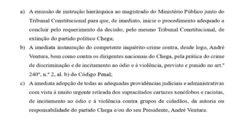 António Garcia Pereira divulgou o requerimento que remeteu ontem, 29 de outubro, ao Procurador-Geral da República para que ordene ao magistrado do Ministério Público junto do Tribunal Constitucional o início do procedimento para requerer a extinção do partido Chega, para que determine a imediata instauração do competente processo penal pela prática dos crimes de discriminação e de incitamento ao ódio e à violência, praticados por André Ventura e pelos principais dirigentes nacionais do Chega, e para determine a adopção de todas as providências judiciais e administrativas adequadas para retirar de imediato das ruas os cartazes xenófobos e racistas de André Ventura e do Chega.