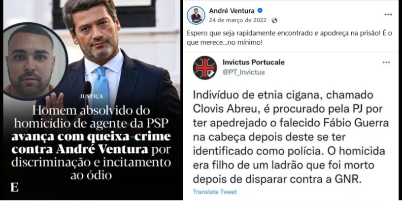 André Ventura, que costuma fazer julgamentos populares nas redes sociais, muito antes dos processos chegarem aos tribunais, com base em notícias, por vezes falsas, publicou no dia 24 de março de 2022, um print de página da extrema-direita que publica notícias de crimes com suspeitos de minorias étnicas, e escreve sobre Clóvis Abreu: