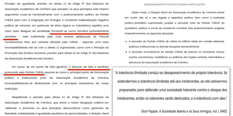 “De um ponto de vista genérico, o discurso de ódio xenófobo promovido pelo Partido Chega assume-se como o principal ponto de fracturação política e institucional junto da Associação Académica de Coimbra…”