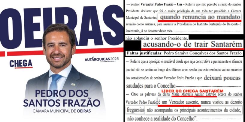 Pedro Saraiva Gonçalves dos Santos Frazão, candidato do partido de André Ventura a Presidente da Câmara Municipal de Oeiras nas Eleições Autárquicas de 12 de outubro de 2025, faltou a 13 reuniões da Câmara Municipal de Santarém enquanto vereador eleito para o mandato 2021-2025.